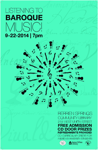 On Monday, September 22, Marianne Kordas, Andrews University music librarian, and Rev. David Alan Reed will present Listening to Baroque Music at the Berrien Springs Community Library at 7pm.