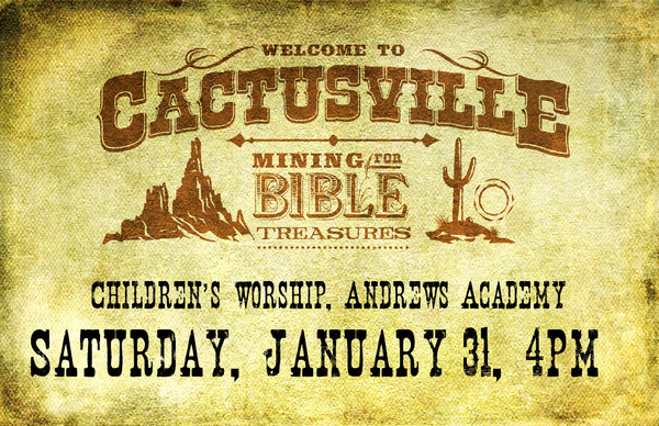 CACTUSVILLE Children's worship returns this Saturday at 4pm at Andrews Academy. Open to kids K-5th grade to have a great time learning about God.  We'll have live music, puppets, stories, crafts, snacks and more!  Invite a friend!