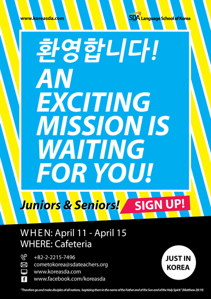Pastor Sang Jae Choi, Academic Dean for SDA Language School of Korea, is recruiting on campus from April 11 - 15th. Stop by the table in the Student Center to meet Pastor Choi, pick up some Korean treats and sign up to join God's mission in Korea!