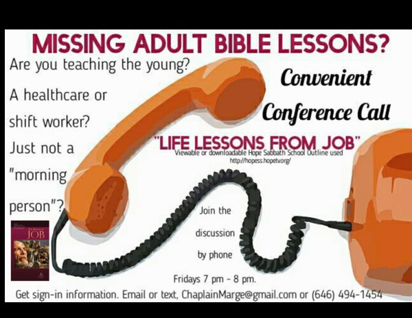 If you are consistently missing adult discussion of the Bible Study Lessons--for any reason--whether because you are ardently and sacrificially focused on caring for others whether as a Sabbath School teacher in the younger Divisions, as a healthcare worker or just because you are just not a "morning person", you are invited to join the discussion!  You have watched Hope Sabbath School but might wish to have YOUR voice included in the interaction.  The Hope Sabbath School Study Materials are used as a guide in our discussions as we ponder 2 main points:  1) What main points appealed to me? and 2) How will I personally apply these points?