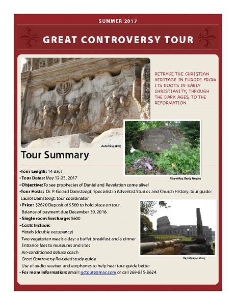 2017 Great Controversy Tour, May 12-25, 2017, with Dr. Gerard Damsteegt of the Andrews University Seventh-day Adventist Theological Seminary.