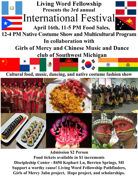 Our 3rd Annual International Festival will feature a native costume pageant with prizes (limit of two contestants per country). We will have food from various countries and cultures (Panama, Guatemala, Puerto Rico, Dominican Republic, Bolivia, Korea, France, Thailand, China, India, Malawi, Philippines to name a few) as well as a cultural program with singing, dancing, activities you can participate in (making kimchee experience, dress up in a hanbok, play a childhood game, learn different languages etc), and raffle ticket drawings with prizes from various area businesses. Raffle tickets given with admission. Children 12 and under are free. This year we will have dancing from "Girls of Mercy" (Malawi), Korean Fan Dance, Papua New Guinean traditional dance and two dances from Chinese Music and Dance club of Southwest Michigan. We will also have a Brazilian dance, a Puerto Rican dance, a Filipino dance, an Indian dance, a Panamanian dance and a Taekwondo demonstration. Come out and support some good causes, have fun and enjoy some good food. Its a one-of-a-kind event you won't want to miss!