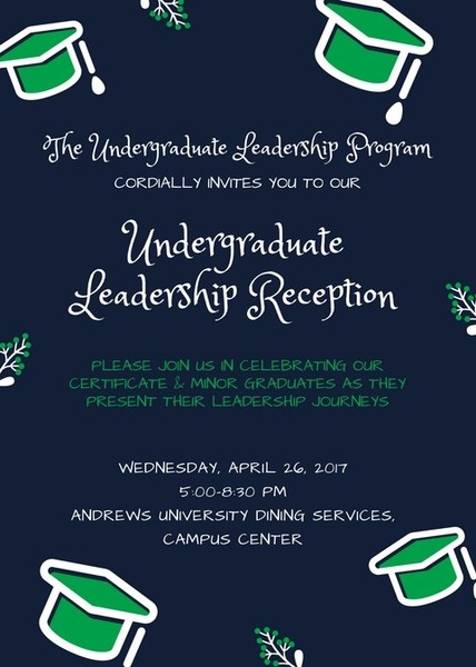 You are invited to the Undergraduate Leadership Program's Spring 2017 reception for our certificate and minor students.  Come hear our seniors share their leadership journeys, see them receive the Randall Leadership medallion for their efforts, and enjoy refreshments while viewing the portfolio tables as we celelebrate the accomplishments of our students.