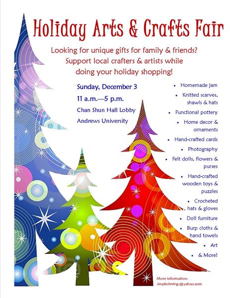 The 4th Annual Holiday Arts & Crafts Fair is scheduled for Sunday, December 3. This event exists primarily to provide Adventist artists and crafters a venue at which to sell their creations. For more information, contact Diane Helbley at simplestirrings@yahoo.com.