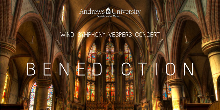 “For our annual Vespers Concert as part of the Andrews University Music Festival, we present a wide variety of inspirational sacred music for wind band. Headlining the program is John Steven’s "Benediction," an appropriate conclusion to a long week as we enter the Sabbath hours. Other pieces include gorgeous arrangements of "The King of Love My Shepherd Is" and "Amazing Grace," as well as sturdy early American hymns "Angel Band" and "Inventions from the Sacred Harp." Come be blessed and inspired by these moving pieces.”