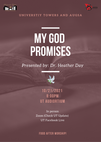 Are you a graduate student seeking to connect with God and other students? Come and join us for a time to worship together as a graduate student community! It's just 30 minutes! Our theme this semester is "My God Promises." We are looking into the Word of God to see the countless promises that God makes and keeps. Join us for music, worship, food and fellowship. You can join us in person in the University Towers auditorium or via Facebook Live (@UTTowers or @AUGSA2020). Hope to see you there!