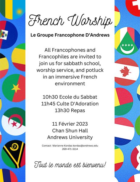 The Groupe Francophone D'Andrews invites you to join us for Sabbath School, worship service and fellowship potluck lunch in an immersive, multicultural francophone environment. Bring your curiosity, your singing voice and a dish to pass! All levels and learners of French welcome.