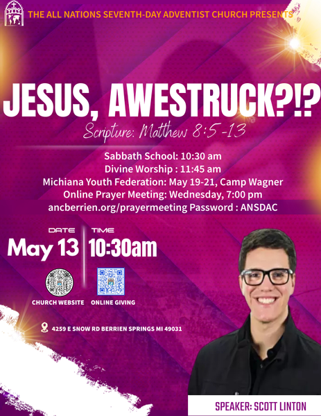 The All Nations Church Family is excited to invite you to our Sabbath School Breakfast this Saturday, May 13th, at 9:45 a.m. Adult and Children's Sabbath School will begin at 10:30 a.m. At 11:45 a.m., we will move into our divine service, where the former Associate Pastor of the Atlanta North Seventh-Day Adventist Church, Scott Linton, will speak on "Jesus, Awestruck?!?" Invite your friends and family. We are located at 4259 E Snow Road, Berrien Springs, MI 49103. See you there!
