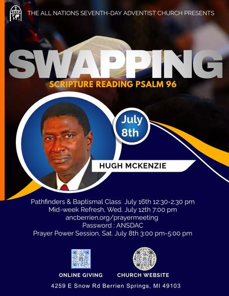 Join the All Nations Church Family for an uplifting worship experience this Sabbath, July 8, at 11:45 a.m. Hugh McKenzie will present on "Swapping." Adult and Children's Sabbath School begins at 10:30 a.m. We are at 4259 E. Snow Rd, Berrien Springs, MI 49103. See you there!