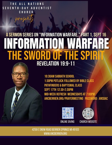 Join us this Sabbath, September 16, at 11:45 a.m. as Martin Hanna presents "Information Warfare: The Sword of the Spirit." Adult and Children's Sabbath School starts at 10:30 a.m. There will be a fellowship potluck directly after service. All are welcome!