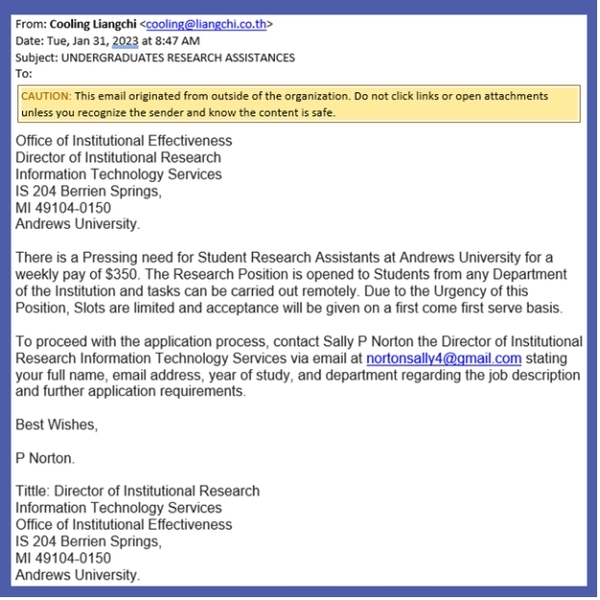 If you receive an unsolicited email or phone call offering a campus job, it is almost certainly a scam. Job offers not given through the Andrews University website should be brought to the attention of ITS Help Desk. Official campus job postings can be found here.