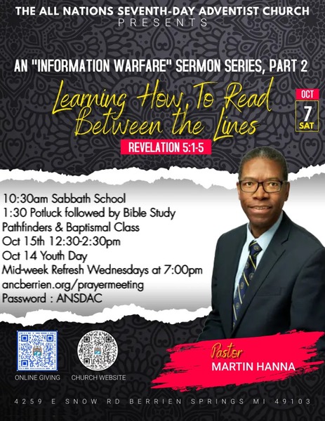 Join us this Sabbath, October 7, at 11:45 a.m. as Martin Hanna presents "Learning How To Read Between The Lines." Adult and Children's Sabbath School begins at 10:30 a.m. There will be a fellowship luncheon following divine service. All are welcome!