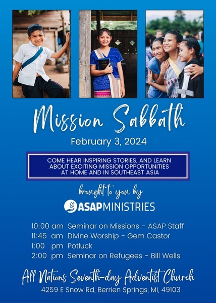 Join us this Saturday, February 3, for Mission Sabbath, brought to you by ASAP Ministries. The event will commence at 10:00 a.m. with a Seminar on Missions led by the ASAP staff. At 11:45 a.m. is divine service, where Gem Castor will present the word. Then, at 1:00 p.m., we will have lunch and a Seminar on Refugees led by Bill Wells at 2:00 p.m. Please invite your friends and family. We can't wait to see you there!
