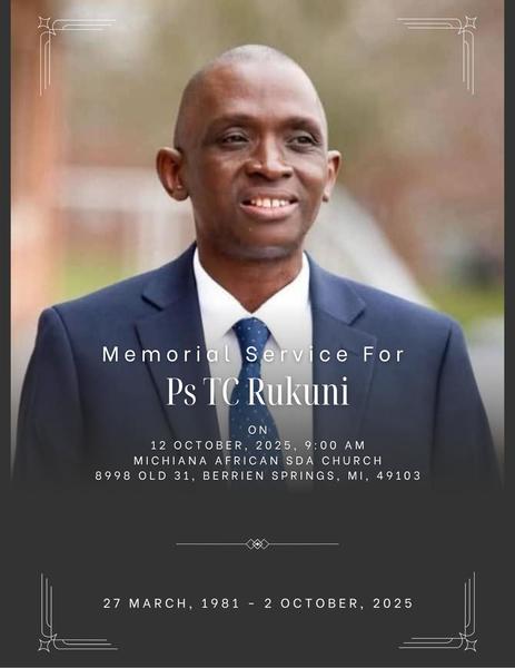 The memorial service for Pastor TC Rukuni will be held this Sunday, Oct. 12, at 9 a.m., at the Village Seventh-Day Adventist Church in Berrien Spring, MI.