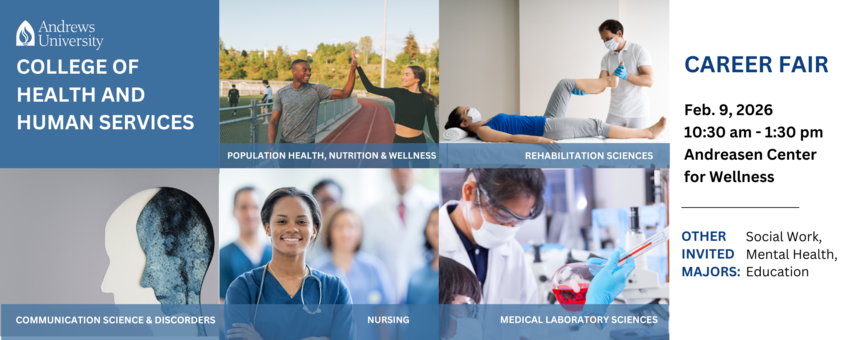 Andrews University is pleased to announce the Health Careers Job Fair to be held on Monday, February 9, from 10:30 a.m. to 1:30 p.m. at the Andreasen Center for Wellness.