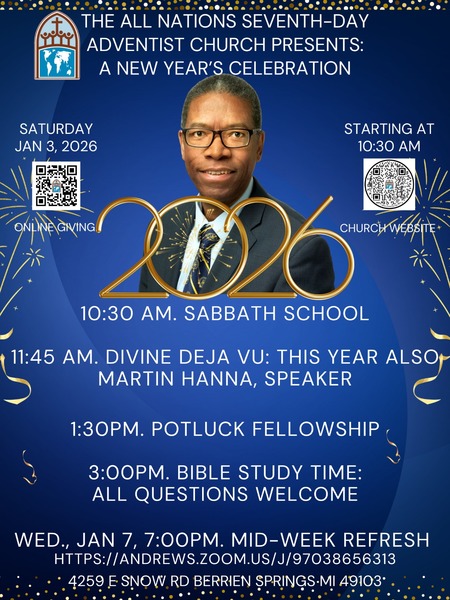 Join us for our New Year's Celebration at the All Nations SDA Church this Saturday, January 3, at 11:45 am, as Martin Hanna presents "Divine Deja Vu: This Year Also." Adult and Children's Sabbath School begins at 10:30 am. We will have a fellowship luncheon after the service, followed by a Bible Study Q&A Session at 3:00 pm. We look forward to seeing you there!