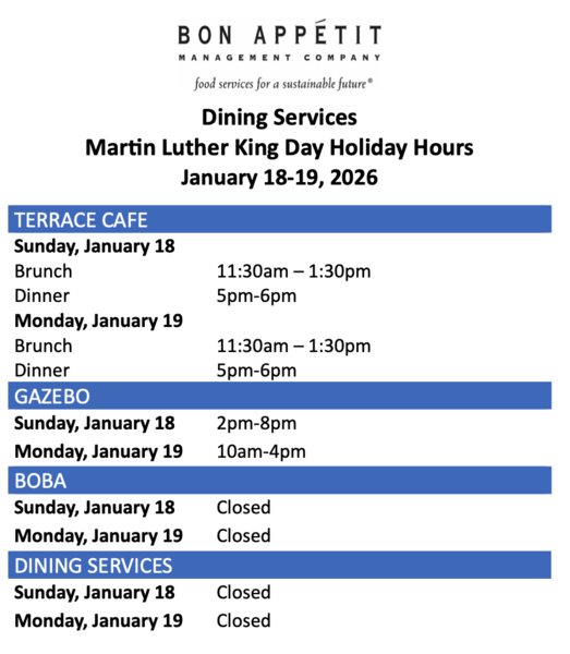 Please find the Dining Services hours of operation for Martin Luther King Jr. Day attached.