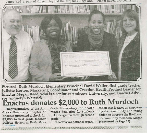 Two free screenings of the Oscar nominated film, Selma will be held on Sunday at Andrews University in Berrien Springs. Andrews Associate Dean for Student Life and Diversity Debbie Weithers (withers) says that the film, which tells the... read moreEnactus Donates $2,000 to Ruth Murdoch Elementary