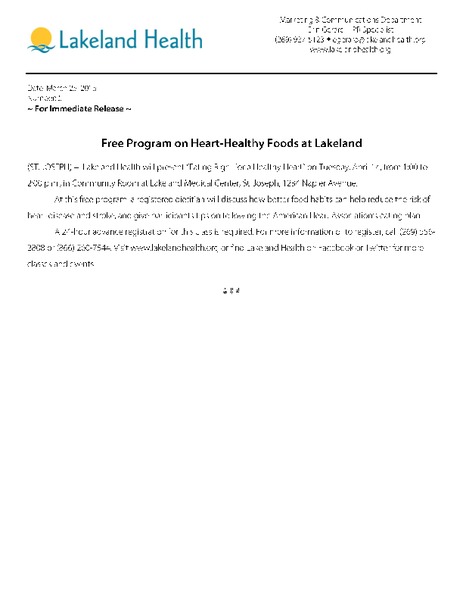 Free Class on Heart-Healthy Cooking (ST. JOSEPH) –  Lakeland Health will offer “Cooking for Your Heart,” a free cooking class for community members. The presentation will include a cooking demonstration by a Lakeland... read more