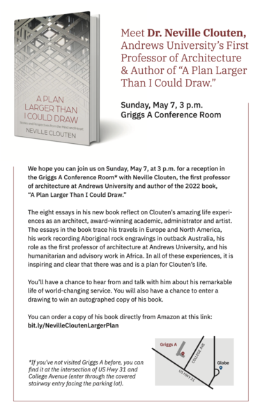 We hope you can join us on Sunday, May 7, at 3 p.m. for a reception in the Griggs A Conference Room* with Neville Clouten, PhD, the first professor of architecture at Andrews University and author of the...