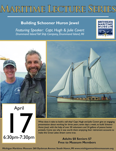 What does it take to build a tall ship? Capt. Hugh Covert and his wife Julie give an engaging presentation about working for three years, seven days a week, to build Schooner Huron Jewel, with the help of...