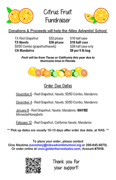 To order TX Red grapefruit, TX navels, a navel/grapefruit combination box, or CA mandarins, please contact Gina (secretary@nilesadventistschool.org or 269-845-8870) or go to www.goldenharvestsales.com, Account #7018, by November 6. See www.NilesAdventistSchool.org...