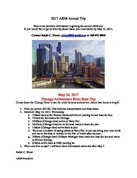 There is still time to make your reservation to go on the Chicago Architecture Boat Tour up to the day before the trip, May 23, 2017. Send your RSVP to Ralph C. Wood at...