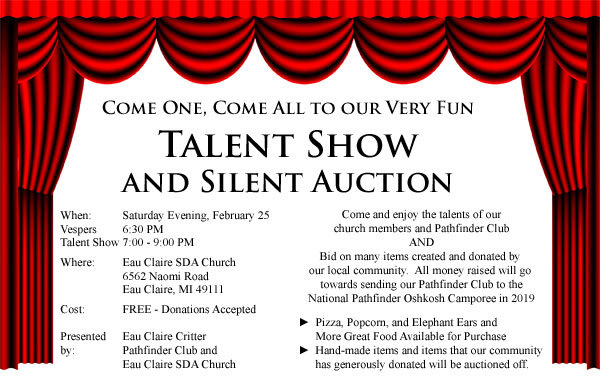 Talent Night and Silent Auction (Pathfinder Fundraiser) Come One, Come All to our Very Fun Talent Show and Silent Auction. Saturday night, February 25, at... read moreVillage Church Services for Feb. 25