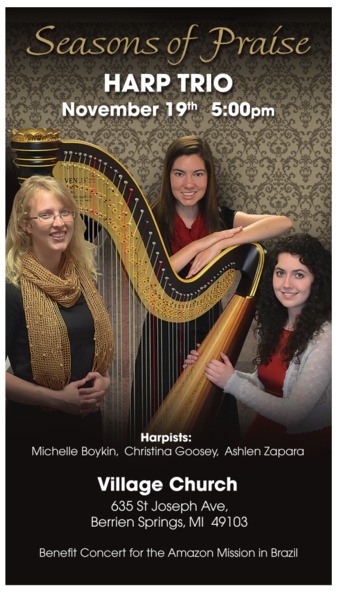 Award winning pianist Beatriz Ritzenthaler will be sharing her talents at the Village SDA church for an uplifting music concert December 3rd at 5 p.m. We encorage you to come and bring a friend for this wonderful event.... read moreSeasons of Praise (Harp Trio)