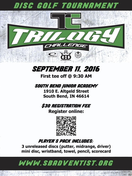 South Bend First SDA Church and South Bend Junior Academy will be hosting a Trilogy Challenge disc golf tournament on Sunday, Sept. 11, 2016 at 9:30 a.m. The cost is $30 per person. Each player will receive three...