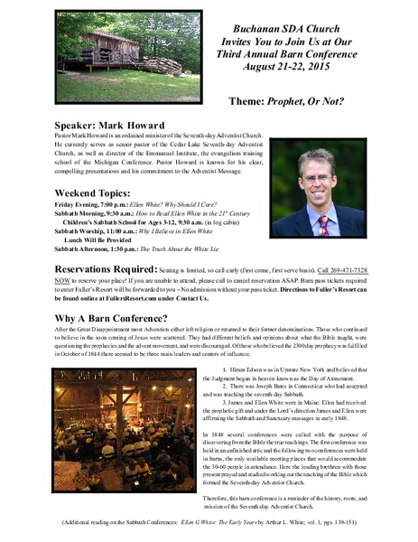 All are welcome to Buchanan SDA Church's Third Annual Barn Conference. Pastor Mark Howard is the featured speaker. For full details, see the attached flyer.