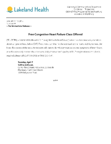 Free Congestive Heart Failure Class Offered (ST. JOSEPH) – Lakeland Health will offer “Living Well with Heart Failure,” a free class for community members about congestive heart failure (CHF). This chronic condition is...