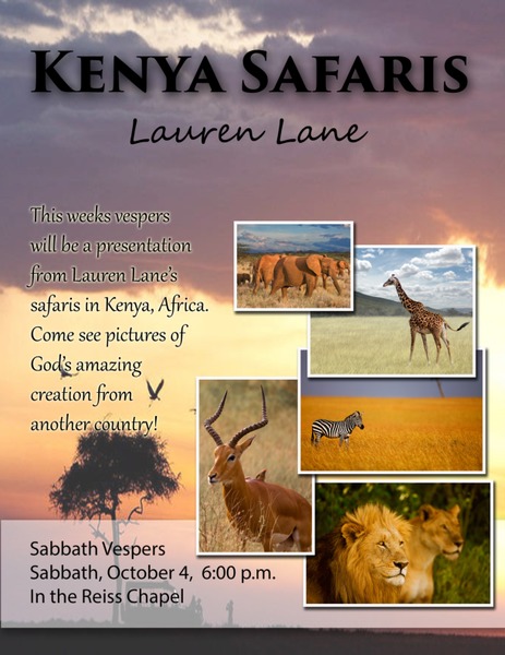 This weeks vespers will be a presentation of pictures from Lauren Lane’s Safaris in Kenya, Africa. Come see pictures of God’s amazing creation from another country! It will be Sabbath, october 4, 6:00 pm in the Riess Chapel... read moreScott Michael Bennet Concert