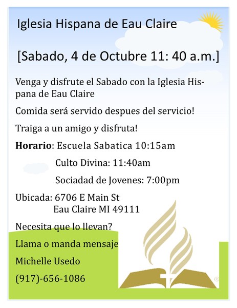 South Bend Junior Academy (SBJA) invites you to their 6th Annual International Food Fair. Join us for some great food, live music, and celebration of culture on Sunday, October 26, from 1–3 p.m. We are located at 1910... read moreEau Claire SDA Church for October 11