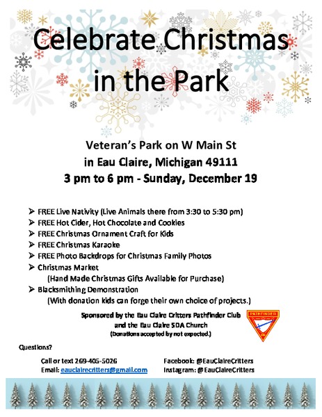 Come experience a celebration of Christ's birth from 3–6 p.m. on Sunday, Dec. 19, at Veteran's Park in downtown Eau Claire located at West Main Street, Eau Claire, Michigan. Featuring a FREE live...