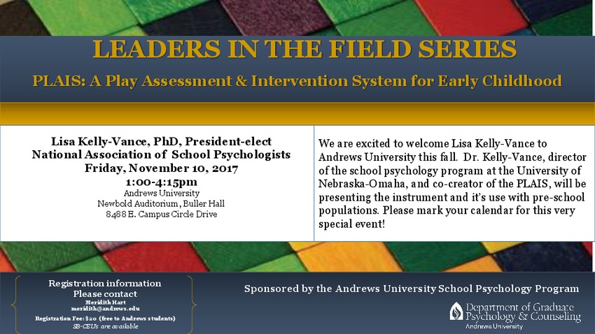 Kelly-Vance, director of the school psychology program at the University of Nebraska-Omaha, and co-creator of the PLAIS, will be presenting the instrument and its use with preschool populations. Please mark your calendars for this very special event. CEUs... read moreSchool Psychology Awareness Week Table