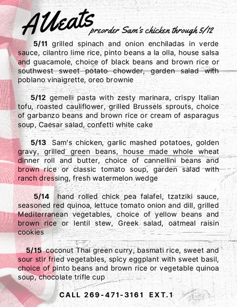 Sabbath lunch made easy. Please call 269-471-3161, ext. 1, Monday–Thursday from 10 a.m.–4 p.m. Pickup/curbside on Friday from 12–4 p.m. Cost is $7.95 per meal. ...