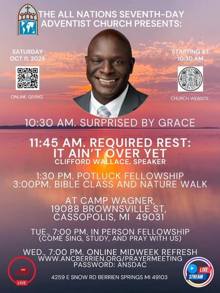 Join us for a Creation Care worship experience at the All Nations Seventh-day Adventist Church this Sabbath, Oct. 4, at 11:45 a.m., as Martin Hanna presents "Making Space for the Creator of Space." Adult and Children's Sabbath School...