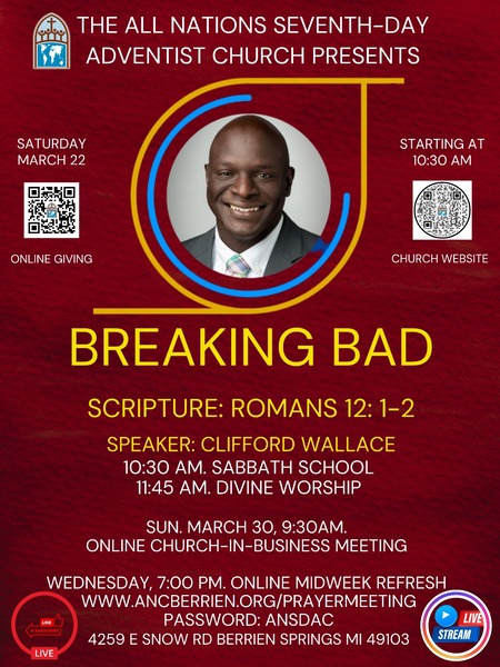 Join us for our worship experience as Clifford Walace presents "Breaking Bad." Adult and Children's Sabbath School begins @ 10:30 am. Breakfast is served @ 10 am. At 6 pm, we will have the Michiana Public Affairs &...