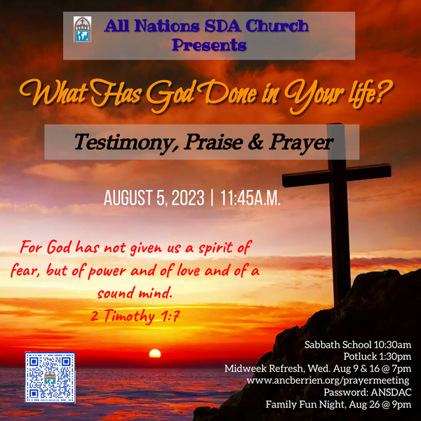 “What Has God Done in Your Life?” Join us this Sabbath, August 5, at 11:45 a.m., as we pray, praise, and share our testimonies of God’s grace and power in our lives! Our Adult... read more