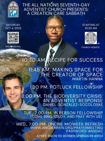 Join us for a Creation Care worship experience at the All Nations SDA Church this Sabbath, October 4, at 11:45 am, as Martin Hanna presents "Making Space for the Creator of Space." Adult and Children's Sabbath School begins...