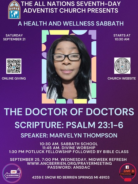 Join us for a Health and Wellness Sabbath this Saturday, September 21, @ 11:45 am as Marvelyn Thompson presents "The Doctor of Doctors." Sabbath School begins @ 10:30 am. Lunch is provided followed by Bible Class. We hope...
